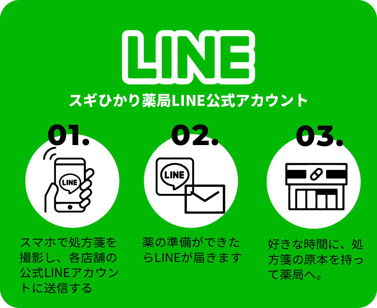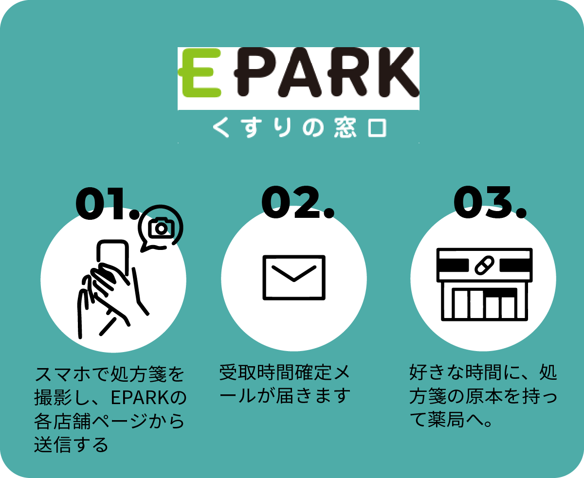 自宅や外出先から処方箋の画像を送るだけで、日時を指定してお薬を受け取れます。待ち時間の短縮でき、スムーズにお薬の受け取れます。薬局で待つことが大変な方、待ち時間を有効に利用したい方は、ぜひご活用ください。くすりの窓口「EPARK」、LINE公式アカウントのご利用が可能です。 店舗一覧より、店舗を指定してアクセスまたは、ダウンロードお願いいたします。
